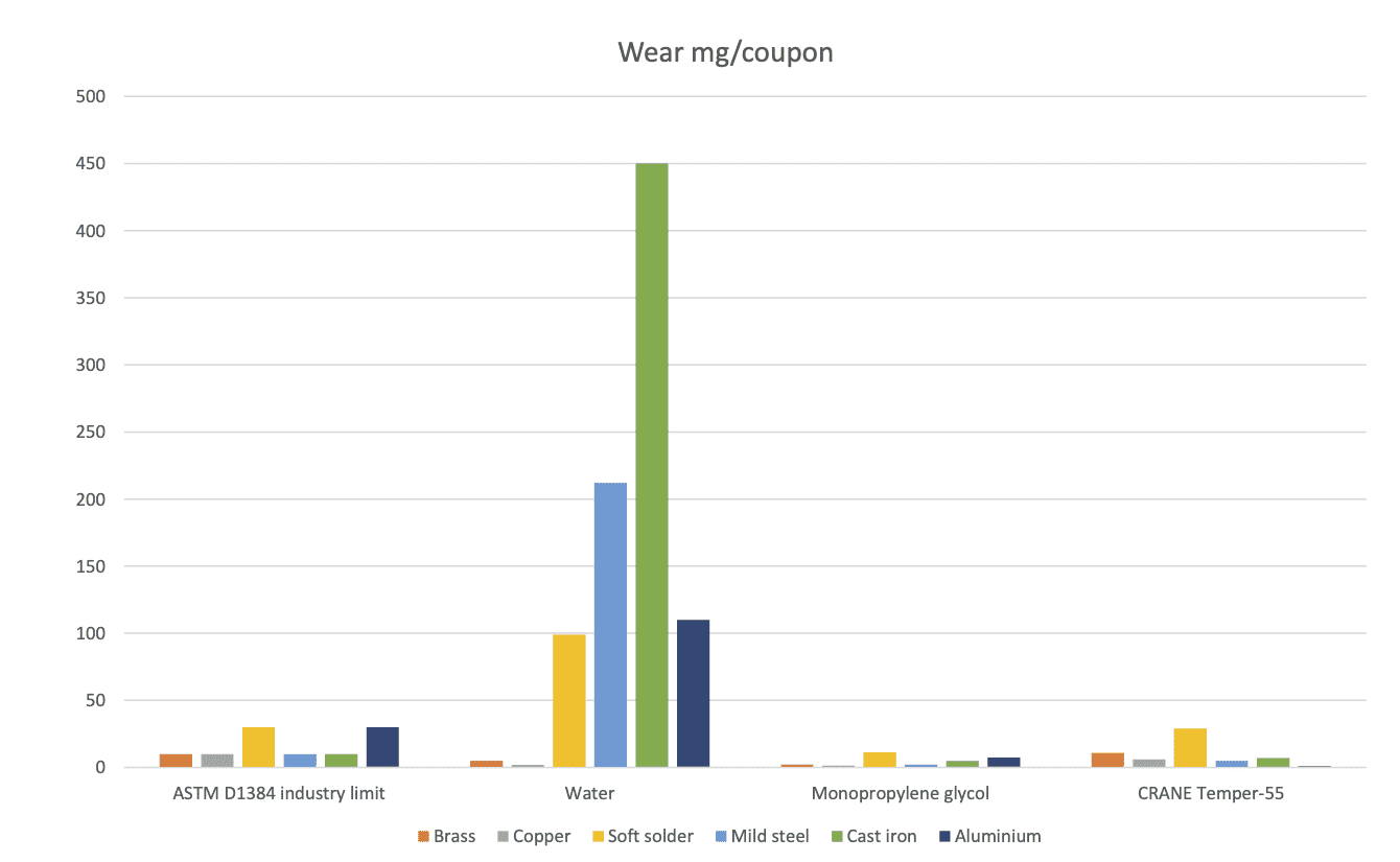 To quantify the corrosion protection efficiency, different corrosion tests are used. KRAHN Specialty Fluids has chosen the ASTM D1384 test, which is the most frequently used among heat transfer fluids. Figures in the table represent the change in weight before and after the test.