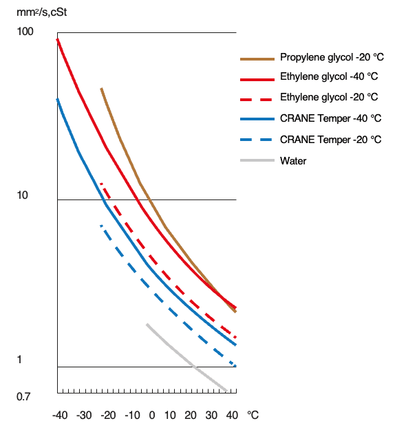 CRANE Temper’s excellent fluid properties in terms of viscosity, specific heat and thermal conductivity make it the ideal choice as Heat Transfer Fluid (HTF) at very low temperatures. The fluid properties not only enable users to use smaller pumps and heat exchangers but also significantly reduce total energy consumption. This applies especially at very low temperatures, as seen in the comparison between CRANE Temper and Glycol presented in the graph.
